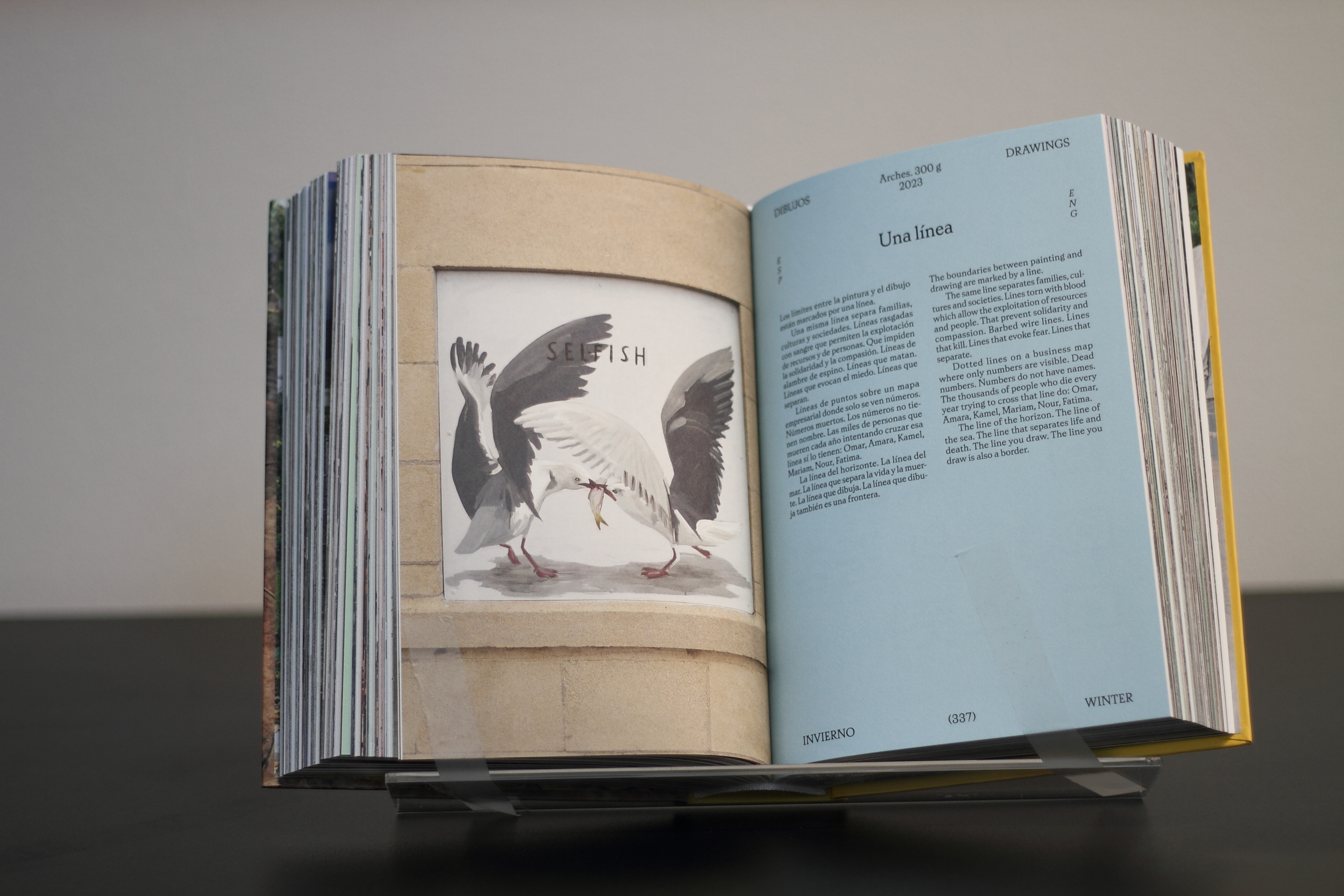 In Los cimientos, Escif organizes roughly a decade of work not chronologically, but thematically and associatively, allowing ideas to echo and unfold. The book avoids linear accounts and embraces transversal, even cubist narrative logics. It visually situates itself at what the artist calls "the intersection between the hubris of the encyclopedia and the deconstruction of a sponge cake" —a delightfully absurd image that perfectly captures the mix of philosophical depth and playful dissonance in his work. The structure draws on the Chinese theory of the five transformations and takes inspiration from the conceptual rhythm of Vivaldi’s concertos.