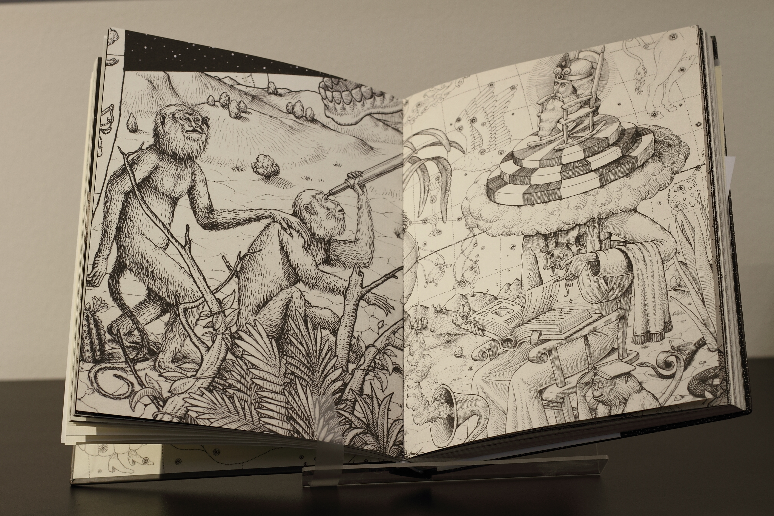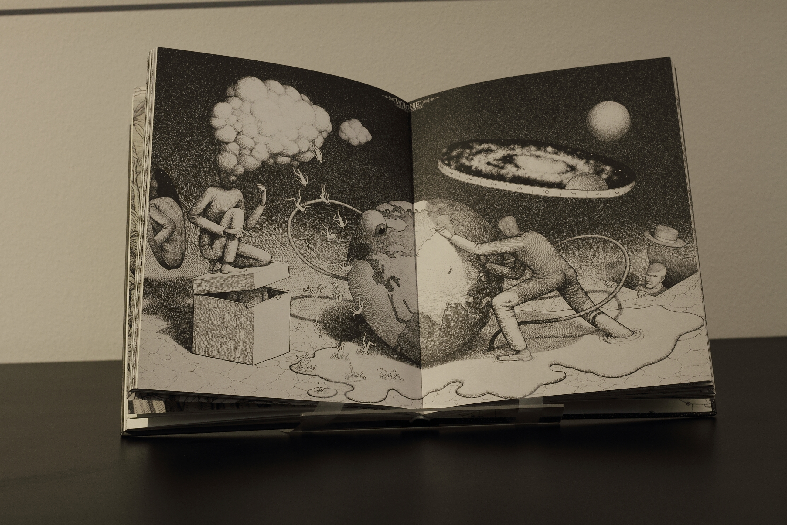 In Los cimientos, Escif organizes roughly a decade of work not chronologically, but thematically and associatively, allowing ideas to echo and unfold. The book avoids linear accounts and embraces transversal, even cubist narrative logics. It visually situates itself at what the artist calls "the intersection between the hubris of the encyclopedia and the deconstruction of a sponge cake" —a delightfully absurd image that perfectly captures the mix of philosophical depth and playful dissonance in his work. The structure draws on the Chinese theory of the five transformations and takes inspiration from the conceptual rhythm of Vivaldi’s concertos.