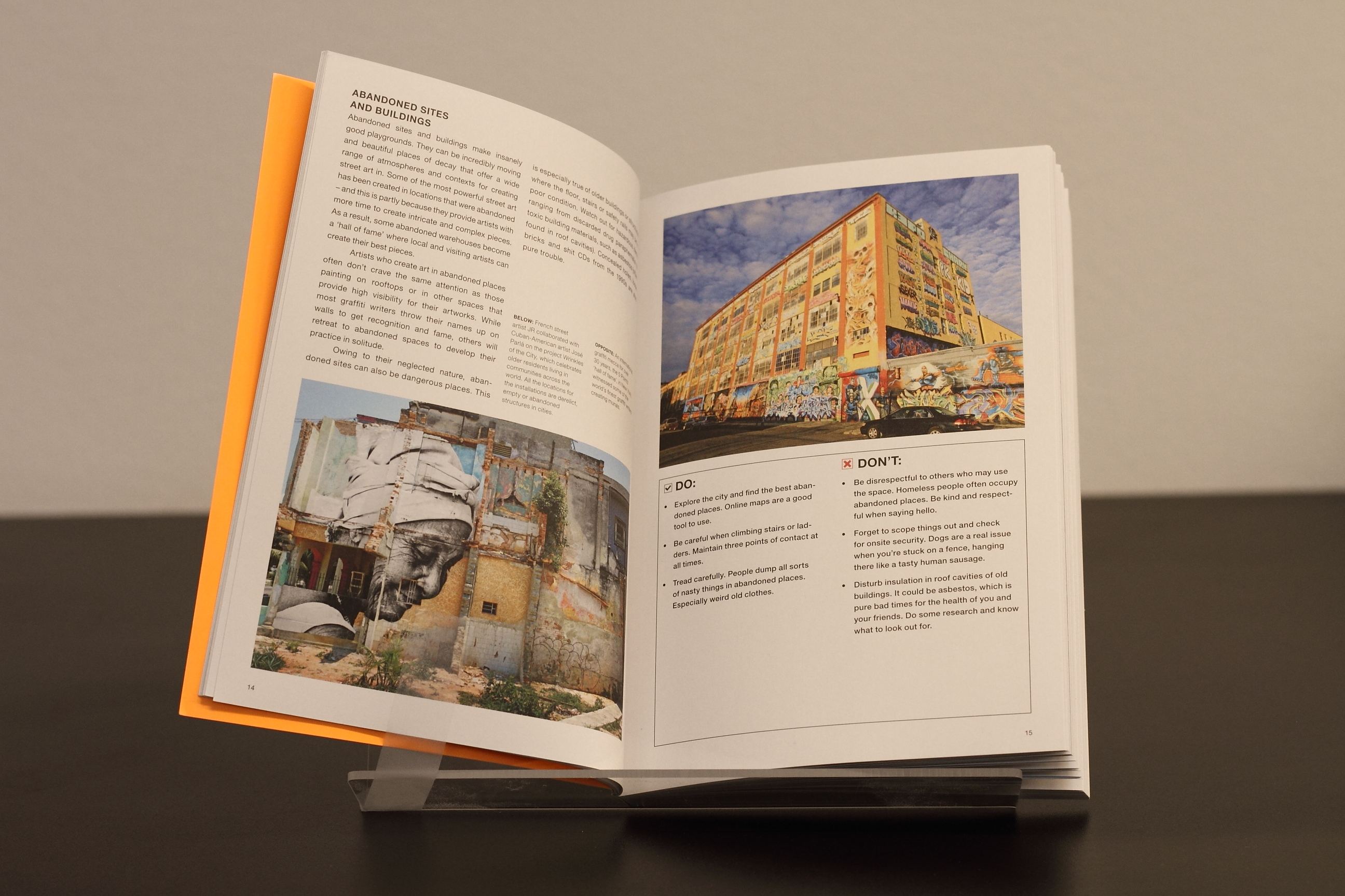 Design-wise, the book is restrained and elegant. Antonio Ballesteros (Formo) lends a light but assured touch in design and layout. The bilingual format (Spanish and English) is unobtrusively handled, often running in parallel columns. Layouts leave generous margins and pauses, reflecting the artist’s preference for emptiness as a space of potential. At times, the book feels like a conceptual map of Escif’s inner mechanics: how he links urban planning to psychological resistance, or how a painted mural can act as both a question and a refusal. Photographs are well printed and unfussy, often showing murals in situ with passersby, shadows, or decay, plainly temporary.